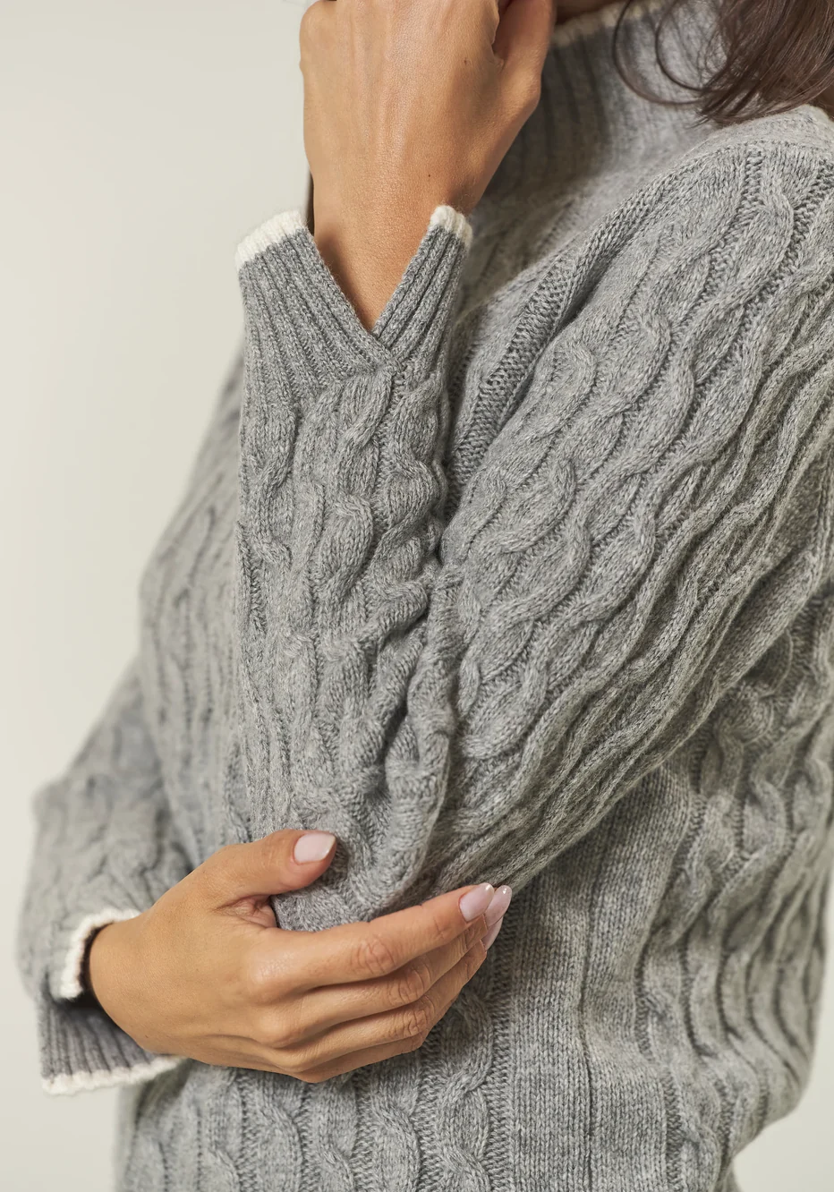 Pull col roulé gris clair pour femme, confectionné dans un mélange de laine, de cachemire et d'autres fibres de qualité supérieure, pour une douceur et une chaleur optimales. Son tricot torsadé classique et intemporel lui confère une élégance indémodable, idéale pour l'hiver