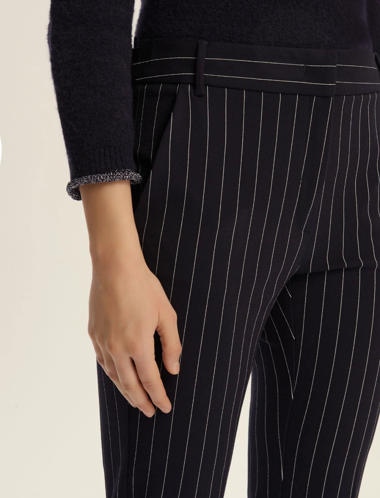 Un modèle élégant dans une matière souple : le nouveau pantalon et la veste à fines rayures en jersey doux. Portez-le au bureau comme un tailleur, ou décontractez-le avec des pulls duveteux et des touches romantiques.