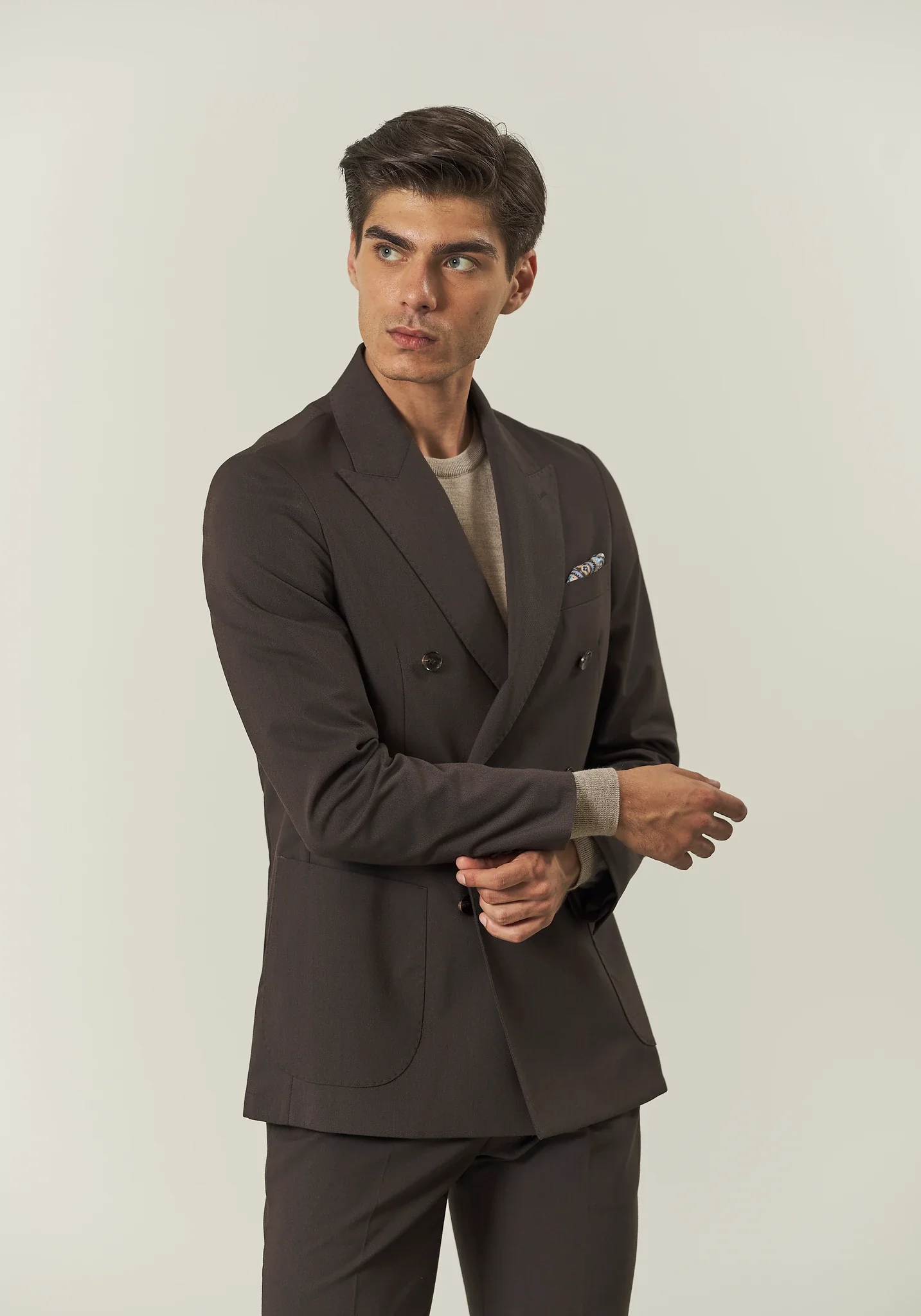 Ce costume croisé marron arbore un style audacieux et contemporain, avec ses revers pointus , ses six boutons et ses poches plaquées qui lui confèrent une touche de sophistication. Confectionné en tissu stretch