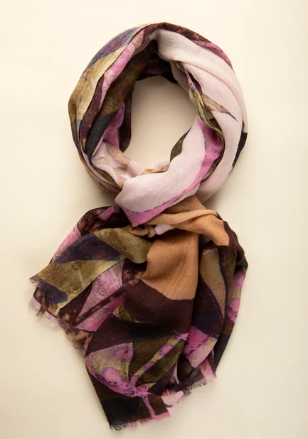 Écharpe pour femme en pure laine , légère et douce, sur fond crème illuminé par un motif de feuilles aux tons chauds bordeaux et brun foncé . Les courtes franges sur les côtés apportent une touche artisanale raffinée, tandis que sa texture douce assure confort et chaleur enveloppante.